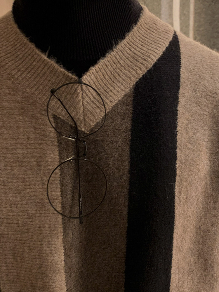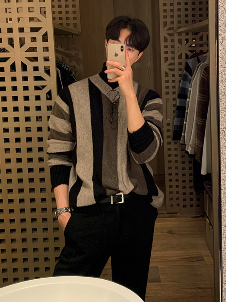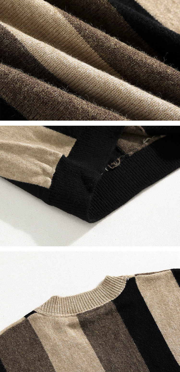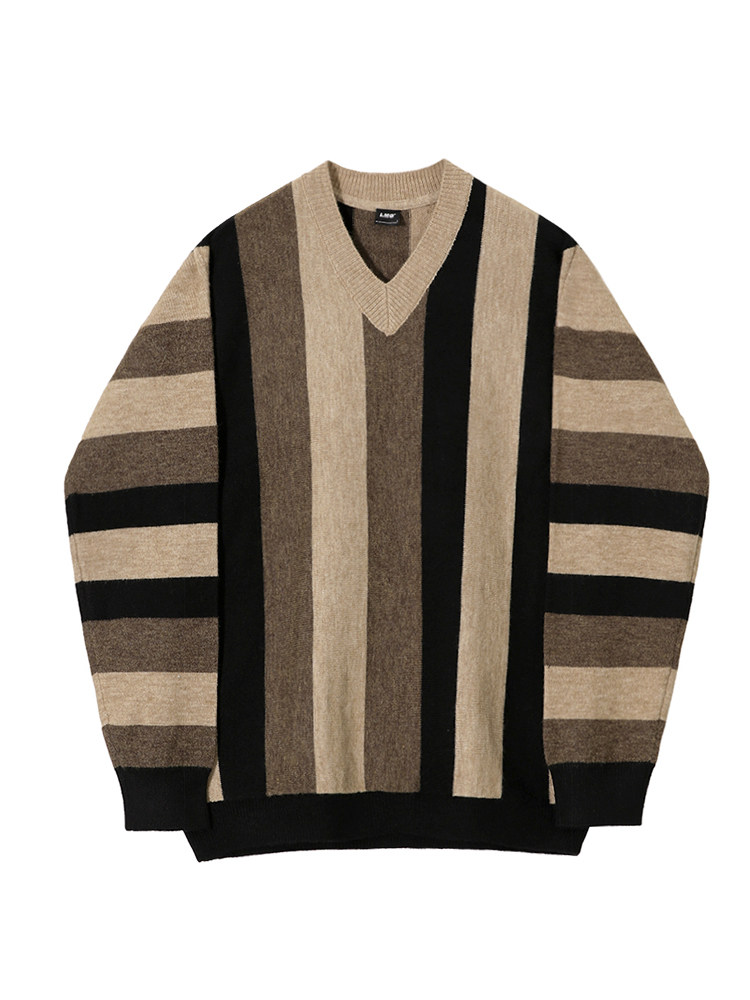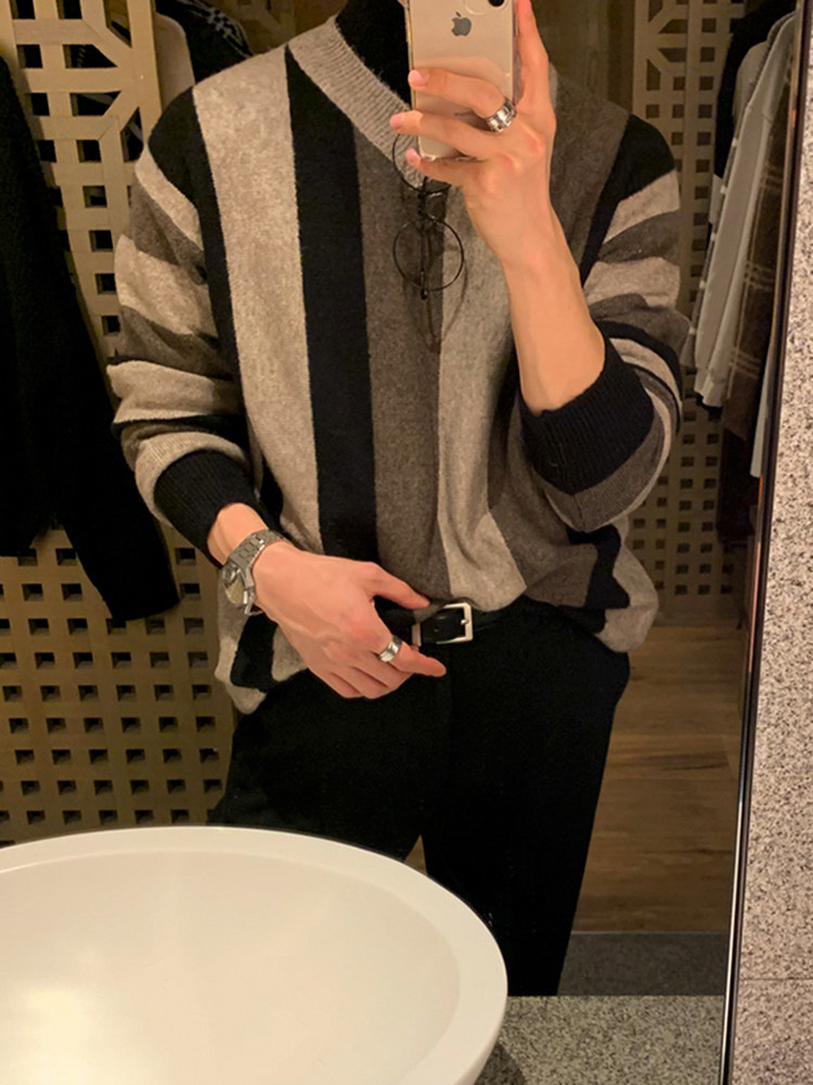 MRCYC Striped V-Neck Knit Sweater Top Men’s Autumn Winter Korean Loose Contrast Thickened Pullover Long Sleeve Sweater